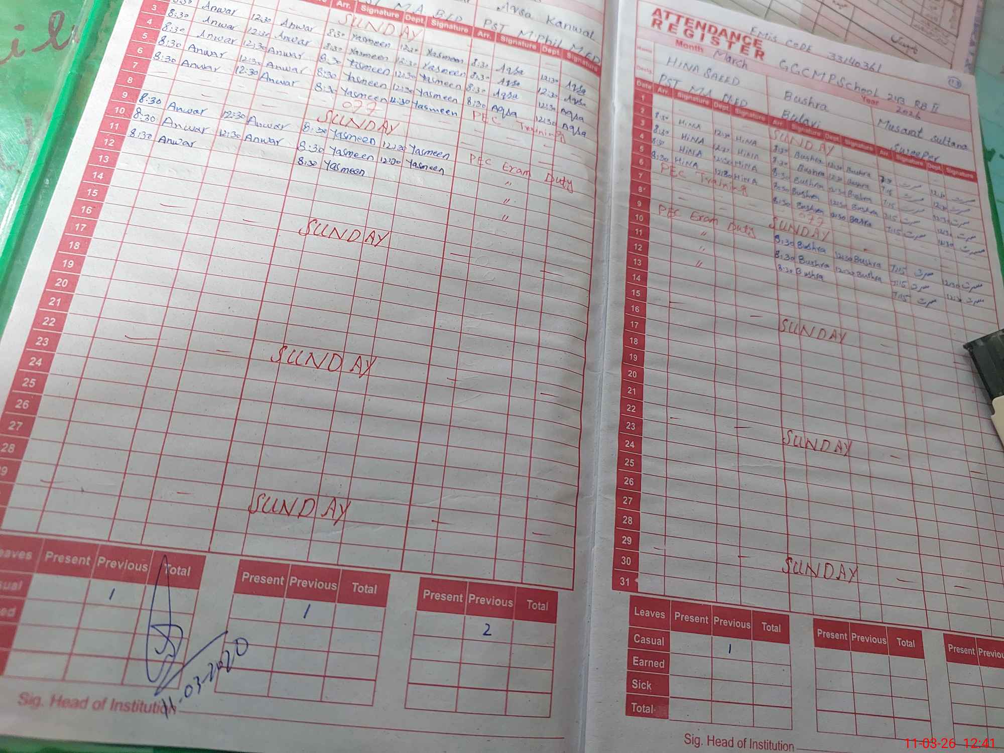 | Leave | Duty | Absent | Maternity | Medical | Ex- Pak |