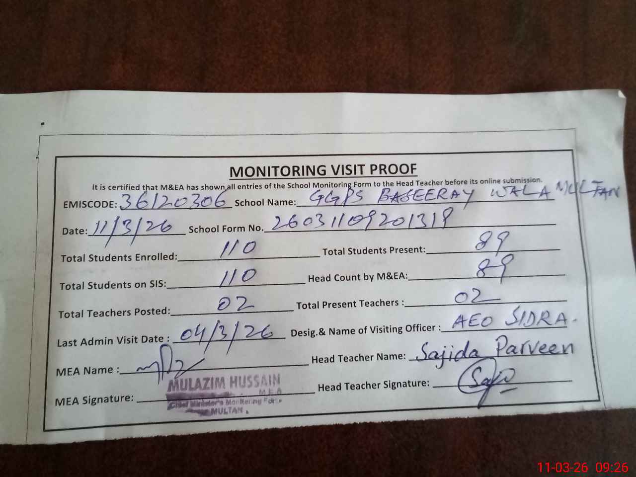 | EMIS Code: 36120306 | Name of School: GGPS BASEERAY WALA SHUJABAD | |||