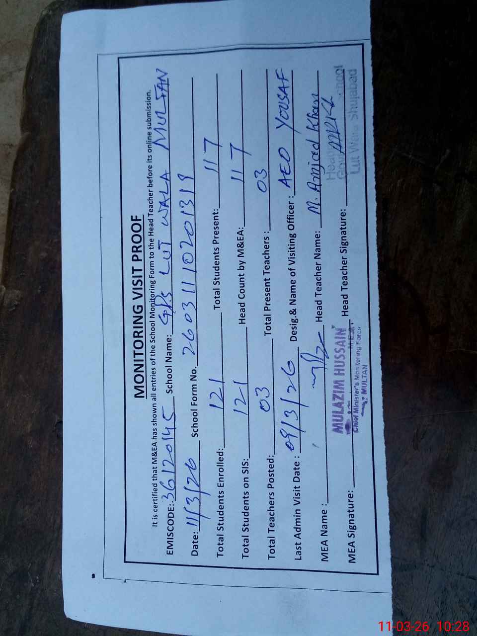 | Attendance Register | Head Teacher | MEA with School | Visit Proof |