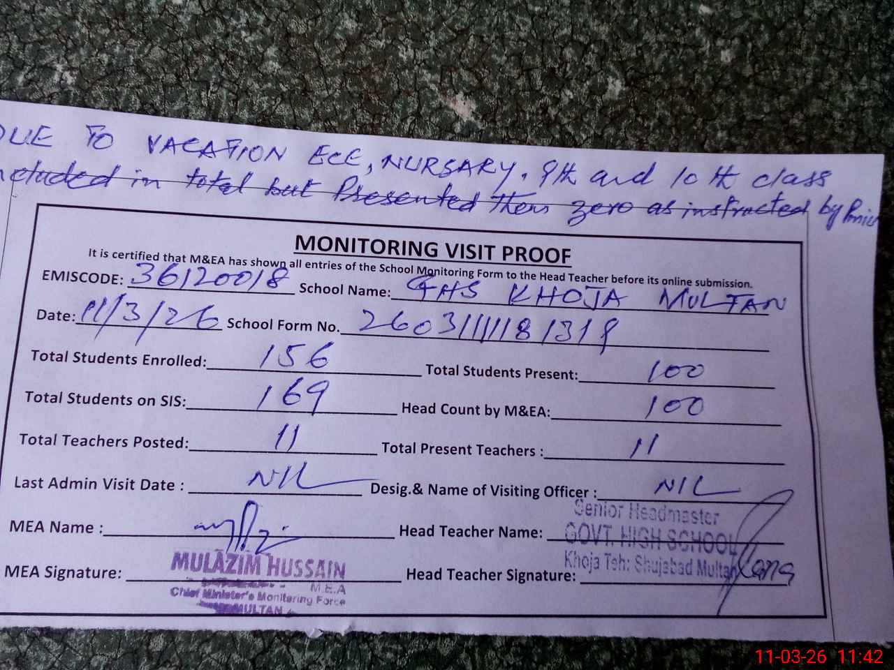| EMIS Code: 36120018 | Name of School: GHS KHOJA P.O. KHOJA TEH. SHUJABAD DISTRICT MULTAN | |||