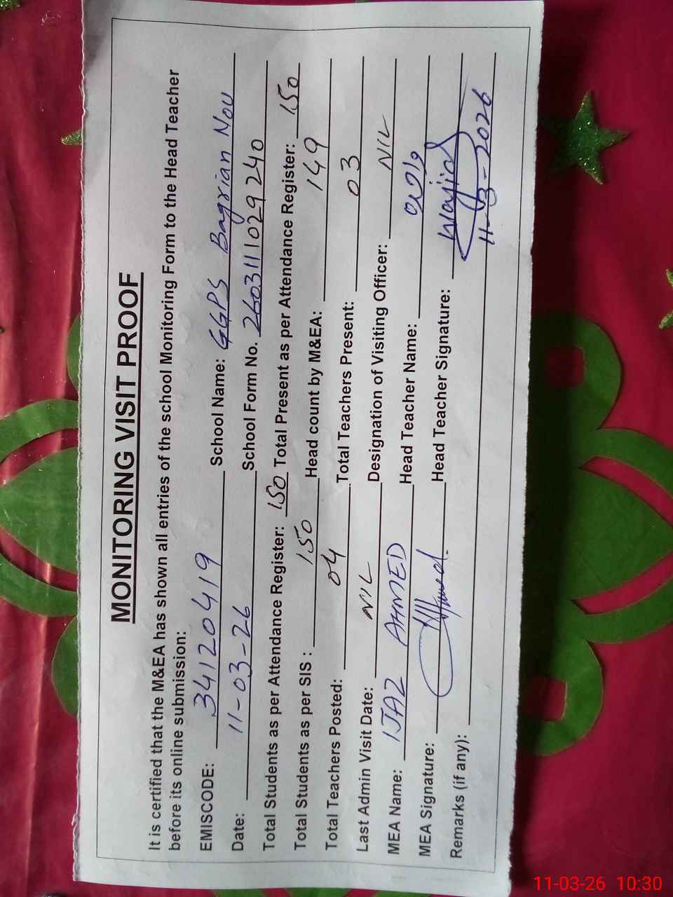 | Attendance Register | Head Teacher | MEA with School | Visit Proof |
