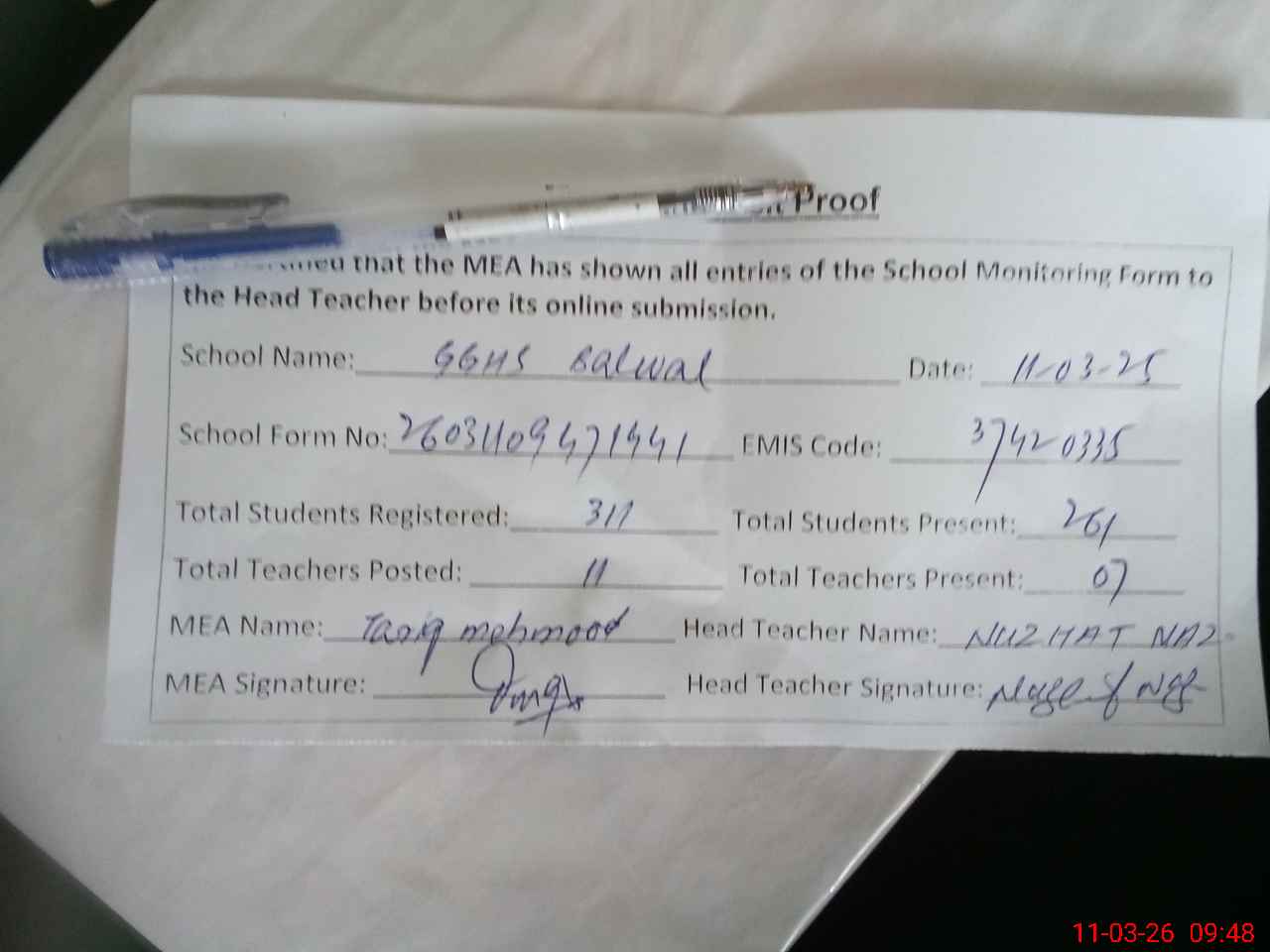 | Attendance Register | Head Teacher | MEA with School | Visit Proof |