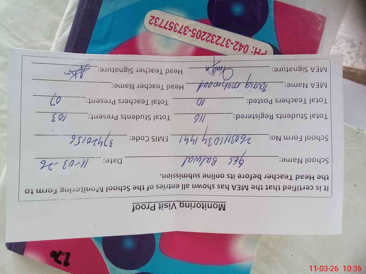 | Name: MRI**** Designation: (School Headmaster's/Headmistress's) SST Phone/Cell Number: 03**** |