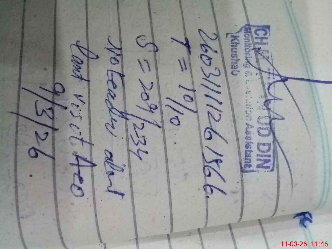 | Remarks (Use Separate Page if Required): GES quaudabad student on sis 234 student on register 234 head count 209 no teacher absent last visit aeo 9/3/26 swing slide required | |||||
