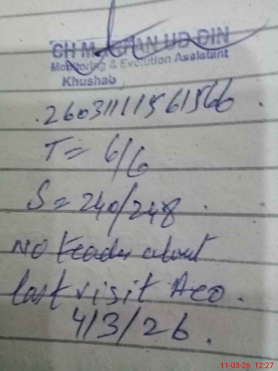 | Remarks (Use Separate Page if Required): gps labour colony student on sis 248 Student on register 248 head count 240 no teacher absent last visit aeo 4/3/26 class is dangerous need new class room non teaching staff required | |||||