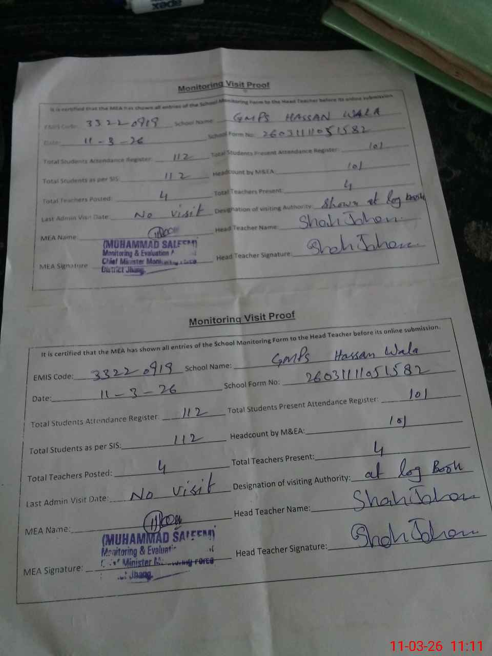 | Attendance Register | Head Teacher | MEA with School | Visit Proof |