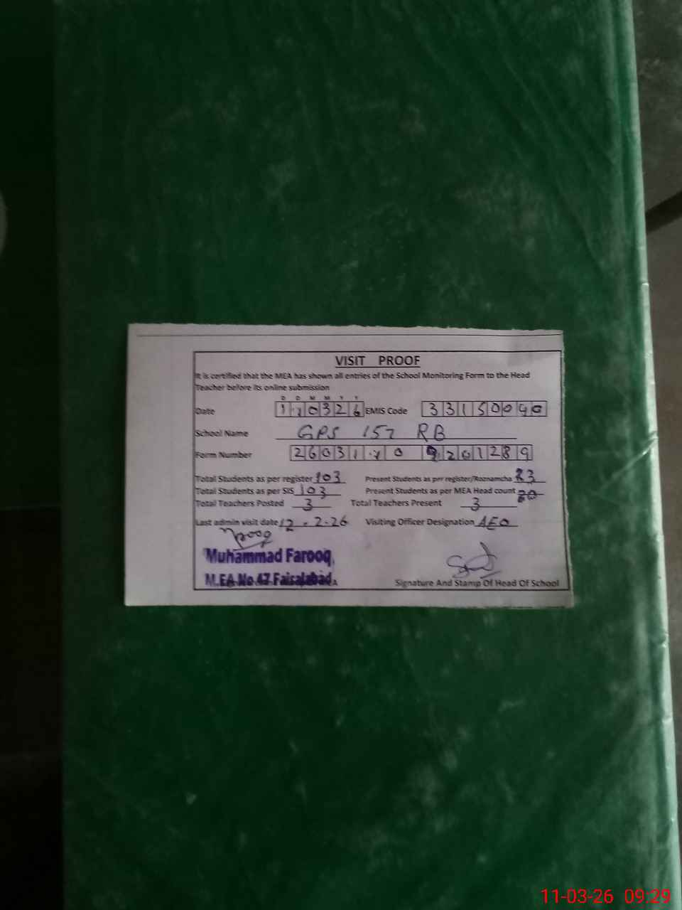 | Attendance Register | Head Teacher | MEA with School | Visit Proof |