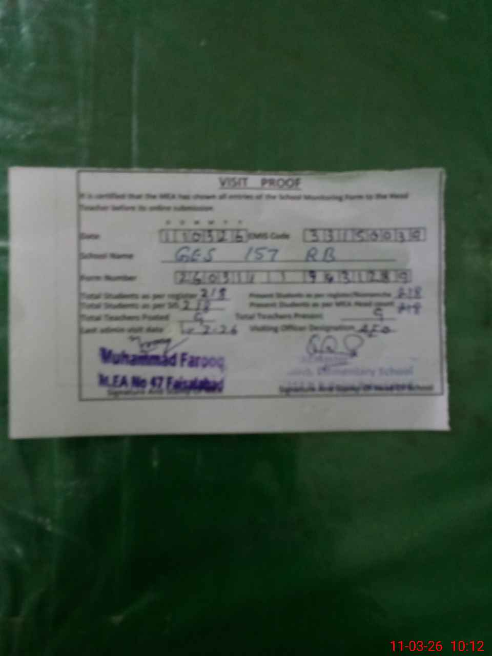 | Attendance Register | Head Teacher | MEA with School | Visit Proof |