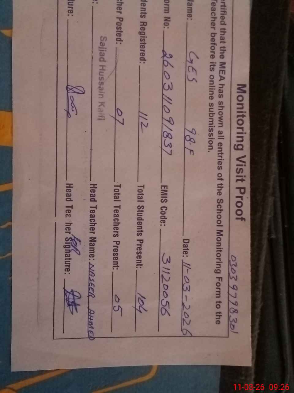 | Monitoring Date: 11-03-2026 | Start Time: 11-03-2026 08:50 AM | End Time: 11-03-2026 09:35 AM | Name of MEA: Sa**** Hu**** Ka**** BN**** 17 | |
