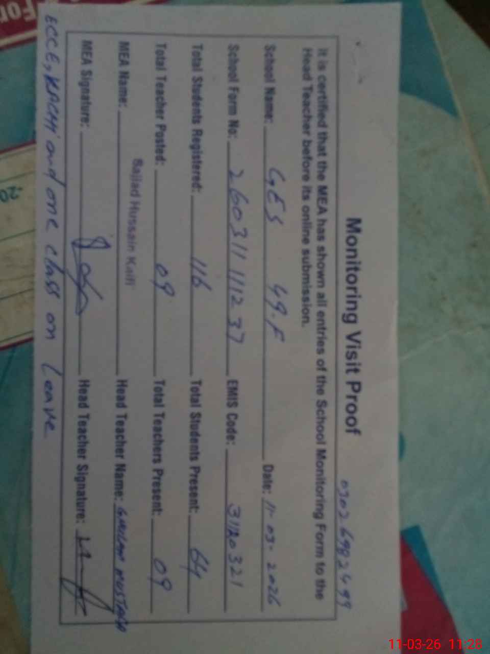 | Attendance Register | Head Teacher | MEA with School | Visit Proof |