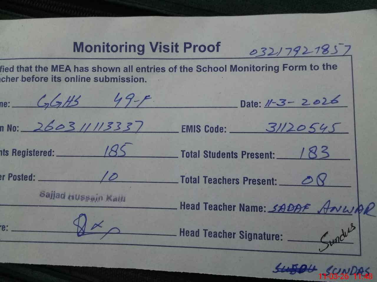 | EMIS Code: 31120545 | Name of School: GGHS CHAK NO. 49/F | |||