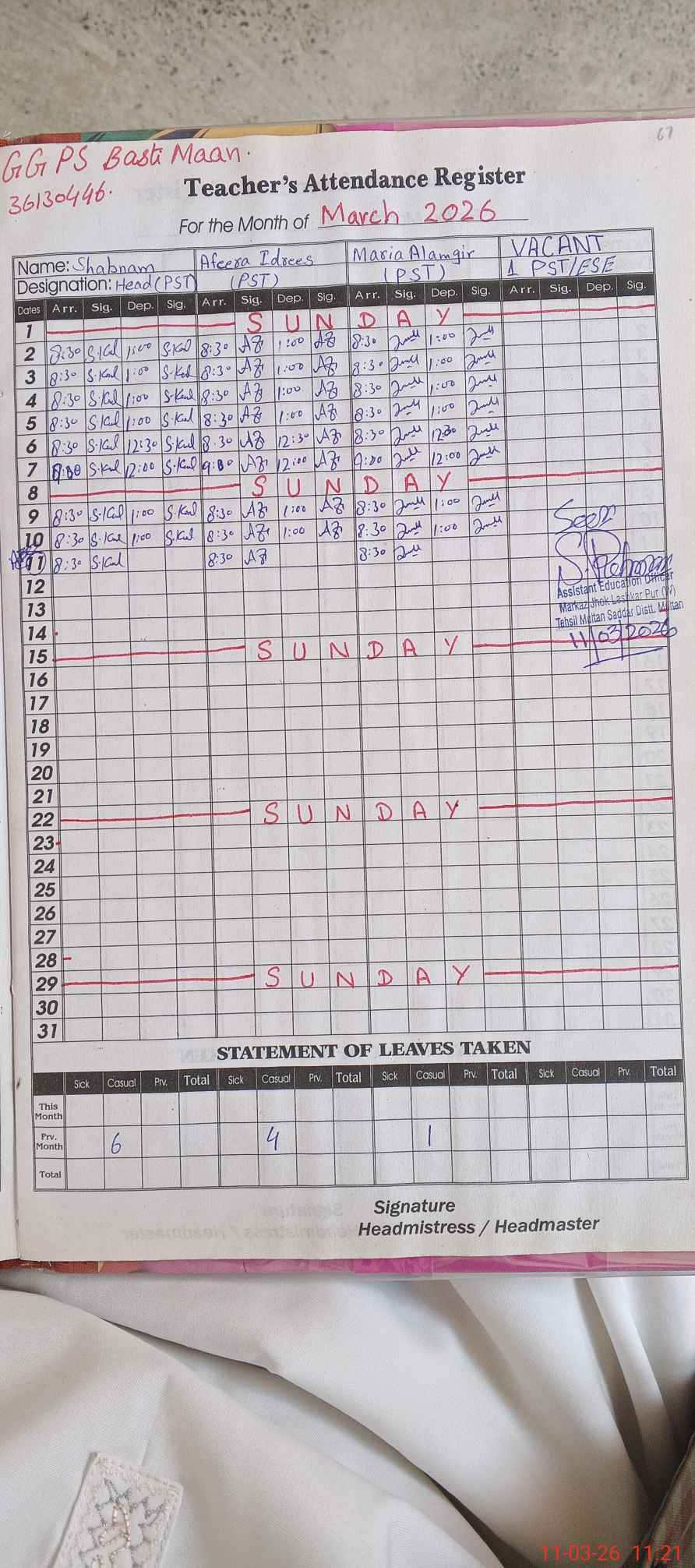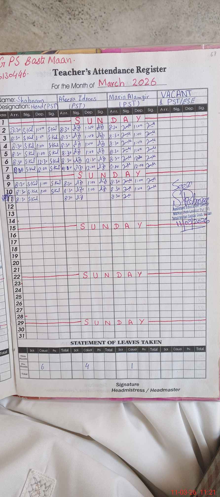 | EMIS Code: 36130446 | Name of School: GGPS BASTI MAAN WALA MULTAN | |||