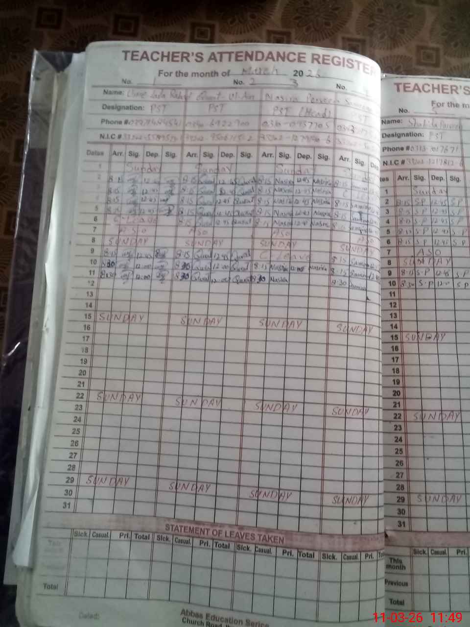 | CNIC | Full Name | Designation | R/C | Absence During Last Calender Month |