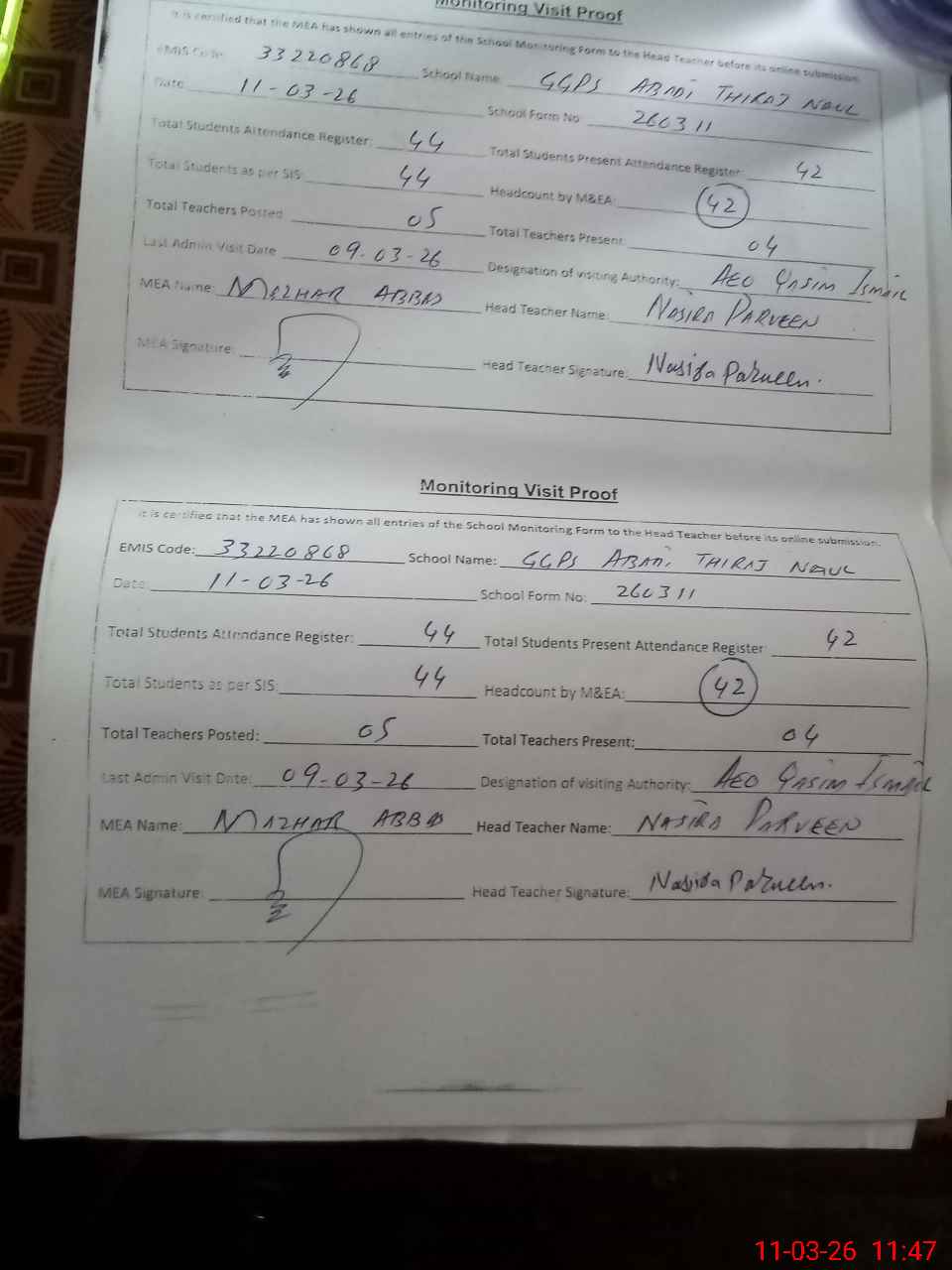 | Attendance Register | Head Teacher | MEA with School | Visit Proof |