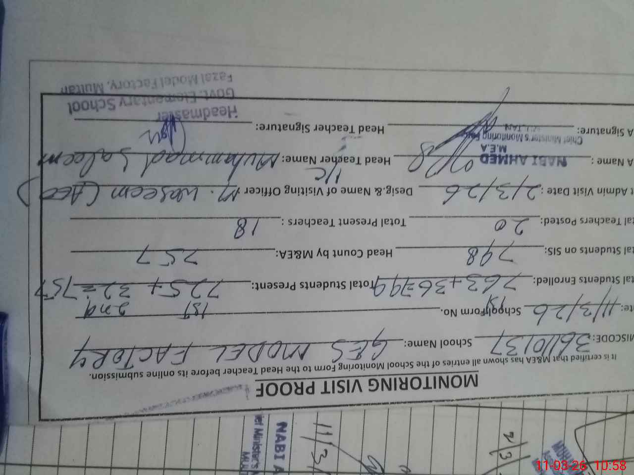 | Certified that this School was Inspected by the Undersigned MEA/DMO Today and the Information Stated Above is as Per Record. | |||||