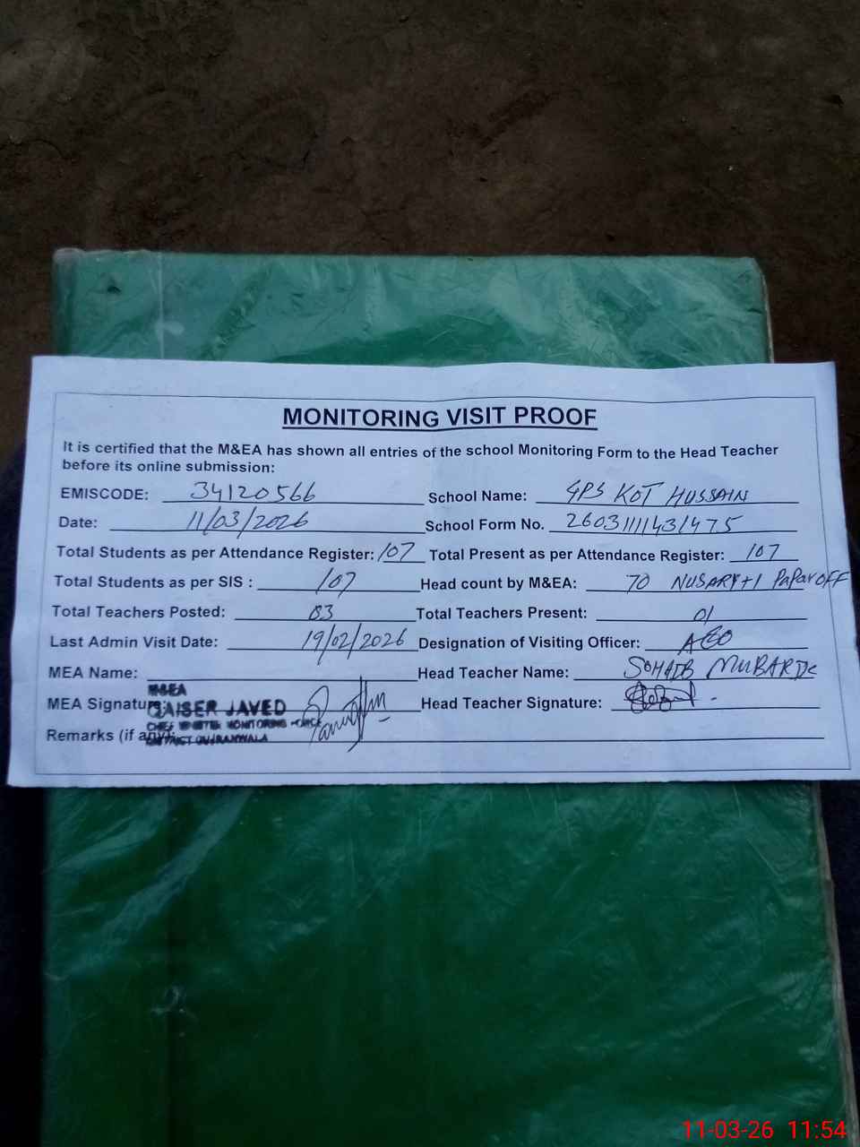 | Attendance Register | Head Teacher | MEA with School | Visit Proof |