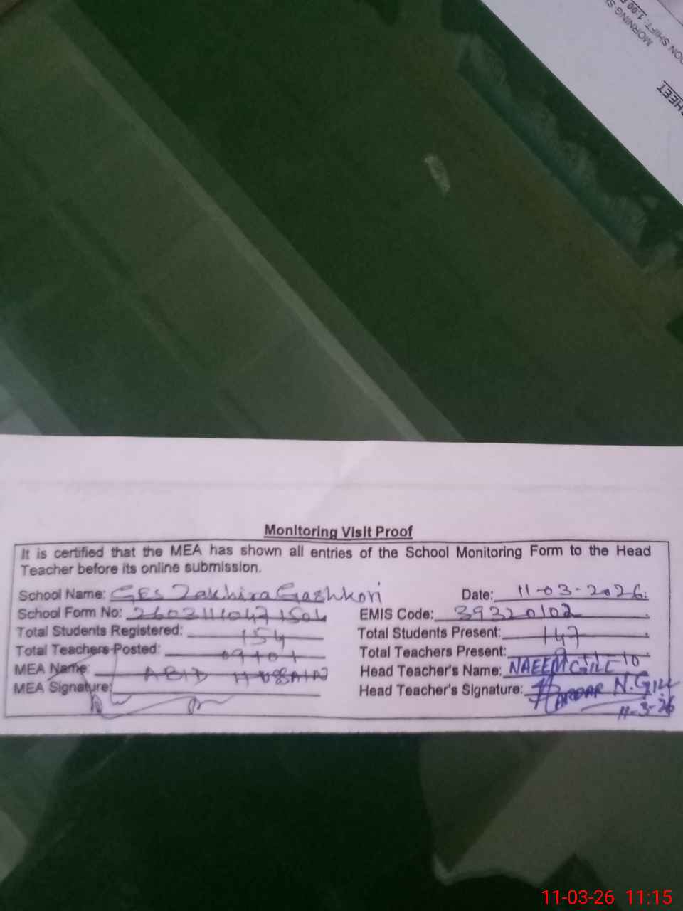 | Attendance Register | Head Teacher | MEA with School | Visit Proof |