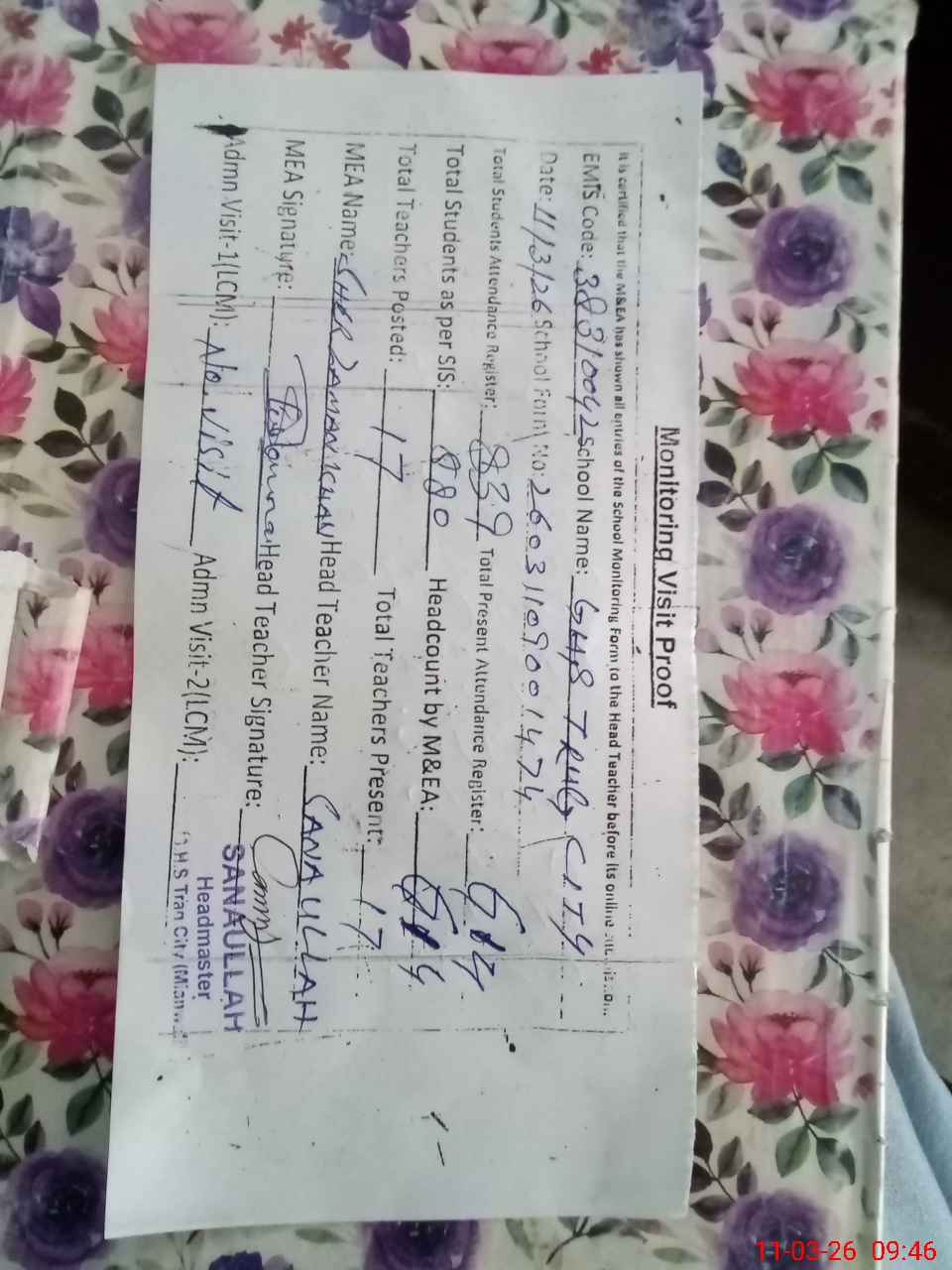 | Attendance Register | Head Teacher | MEA with School | Visit Proof |