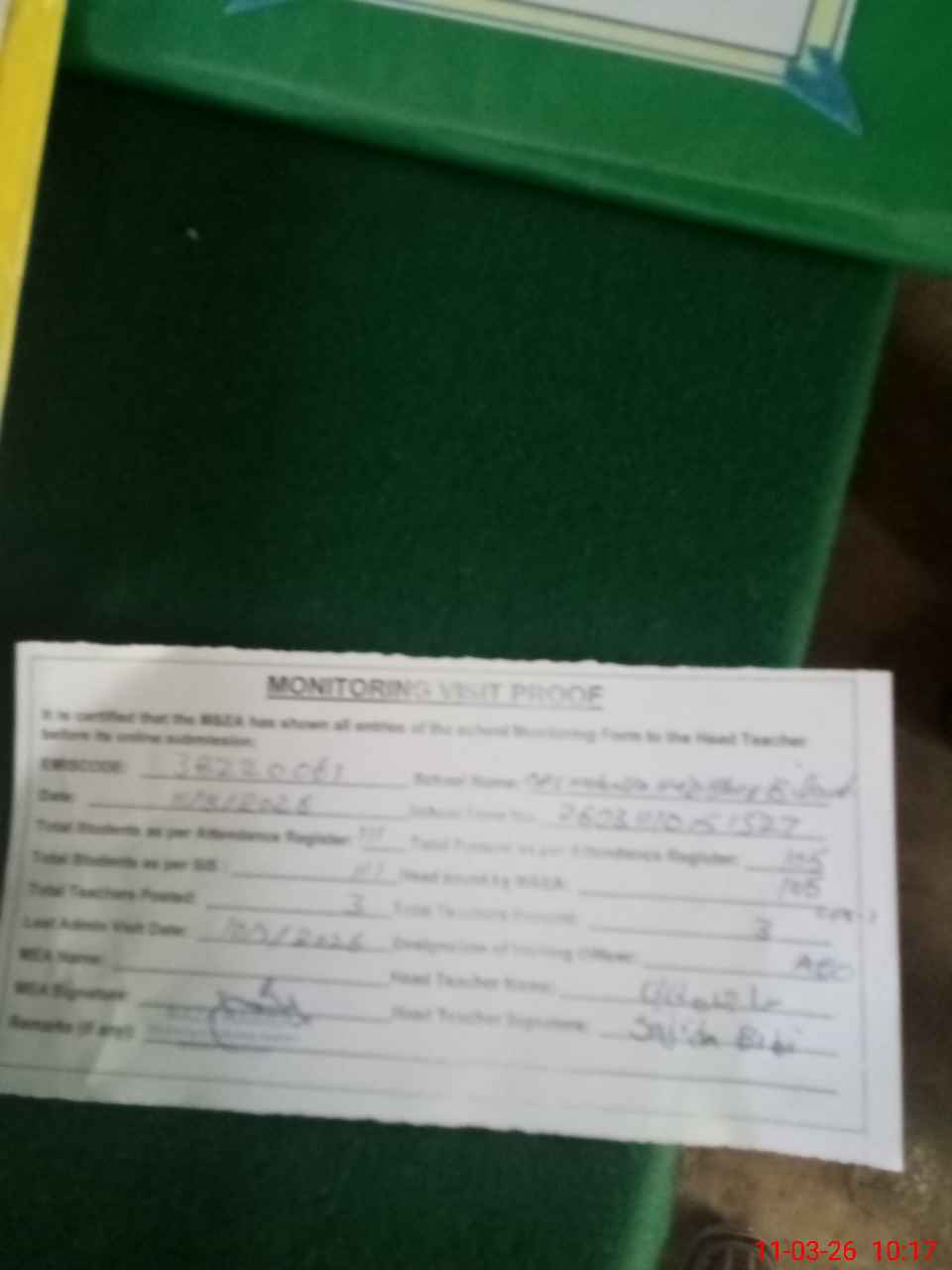 | Attendance Register | Head Teacher | MEA with School | Visit Proof |