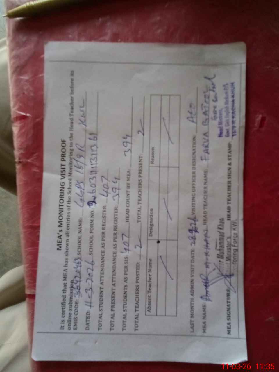 | Attendance Register | Head Teacher | MEA with School | Visit Proof |