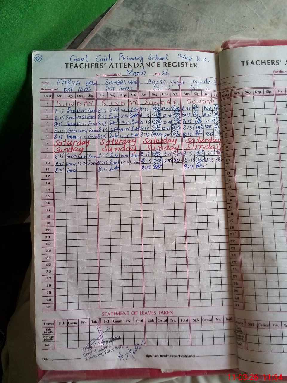 | Monitoring Date: 11-03-2026 | Start Time: 11-03-2026 11:13 AM | End Time: 11-03-2026 11:38 AM | Name of MEA: Am**** Mu**** Kh**** | |