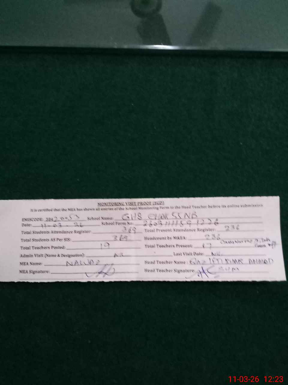 | Attendance Register | Head Teacher | MEA with School | Visit Proof |