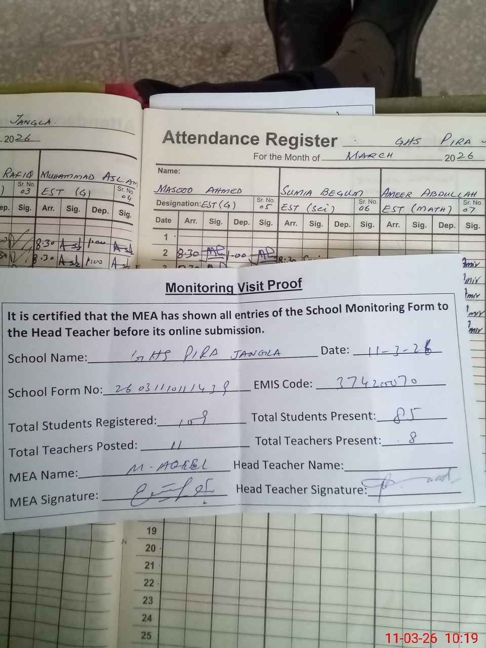| Attendance Register | Head Teacher | MEA with School | Visit Proof |