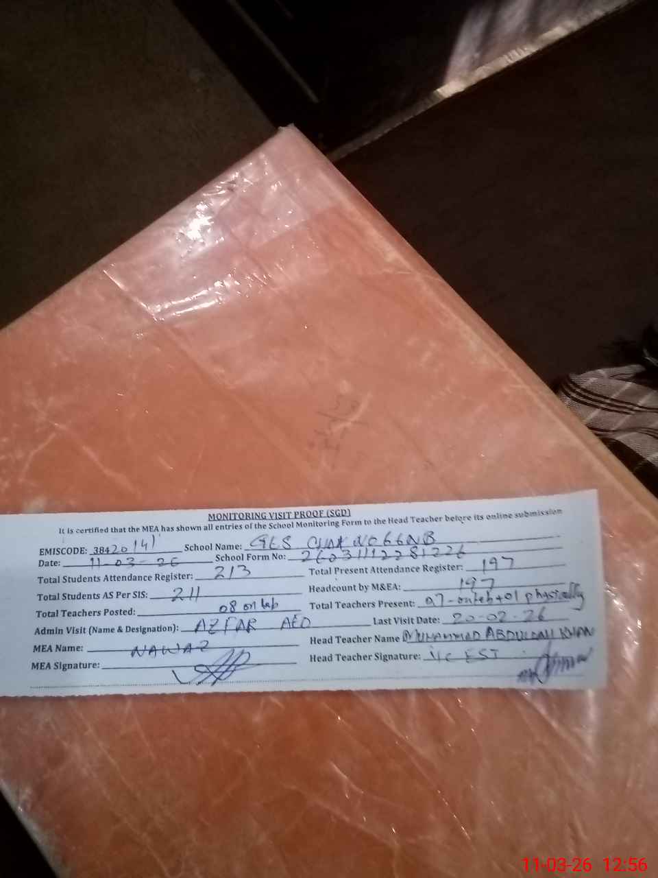 | Attendance Register | Head Teacher | MEA with School | Visit Proof |