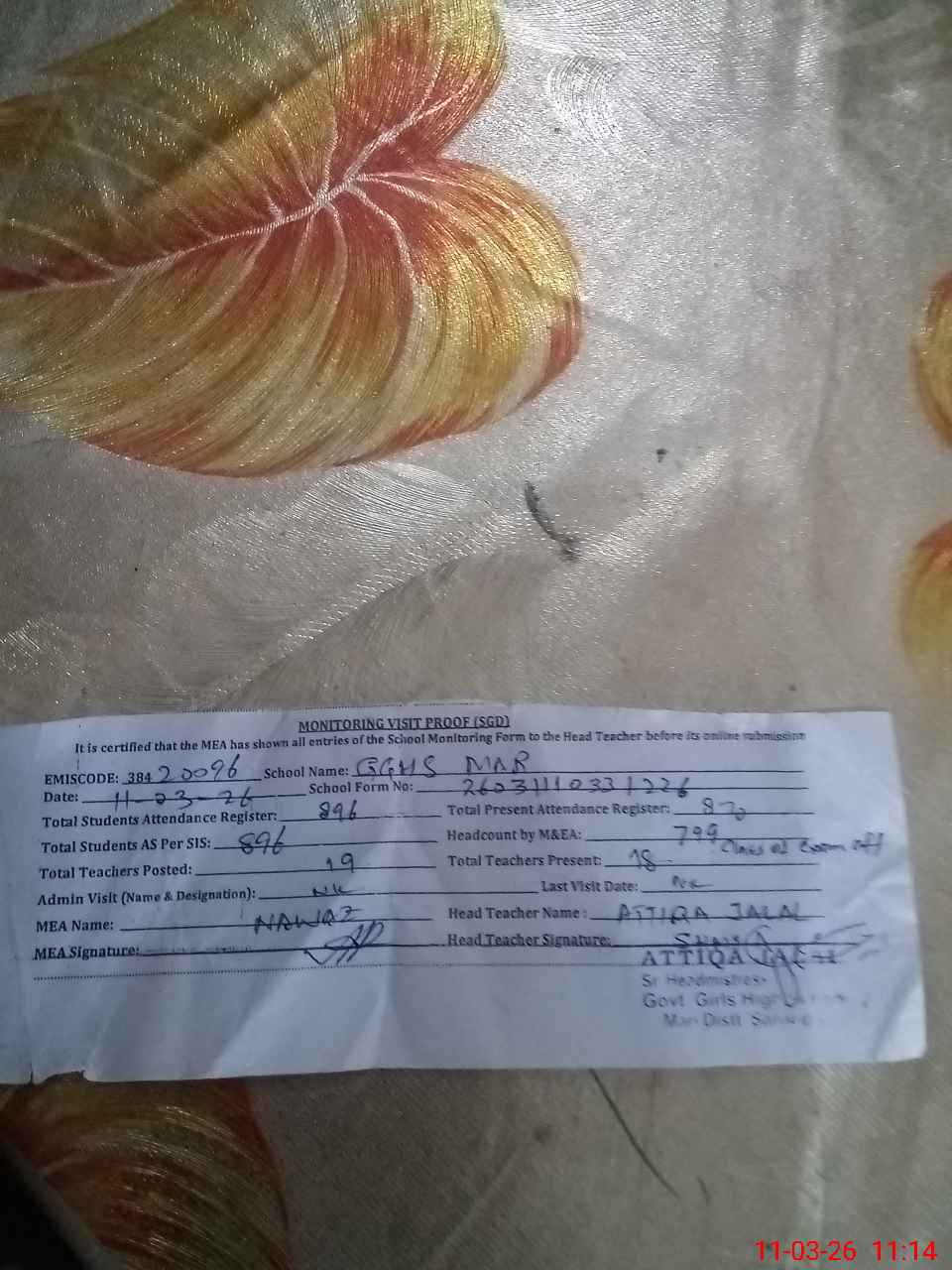 | Attendance Register | Head Teacher | MEA with School | Visit Proof |