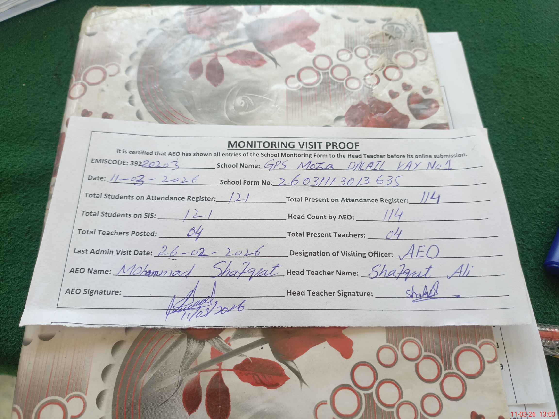 | Attendance Register | Head Teacher | MEA with School | Visit Proof |