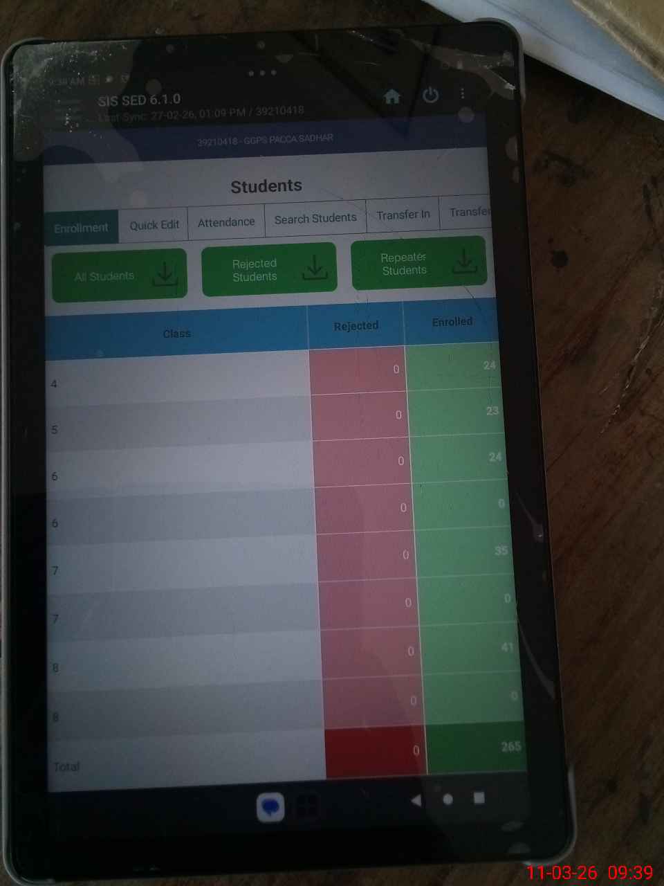 | Total no. of Classrooms: 6 No. of Classrooms Used for Teaching: 4 No. of Classrooms Storing Old Furniture, FTBs, etc: 0Comments if Any: Nil |