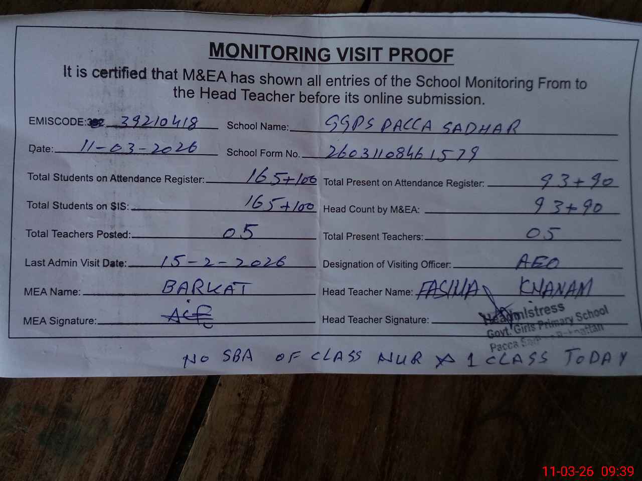 | Remarks (Use Separate Page if Required): No SBA of class Nursery and one class | |||||
