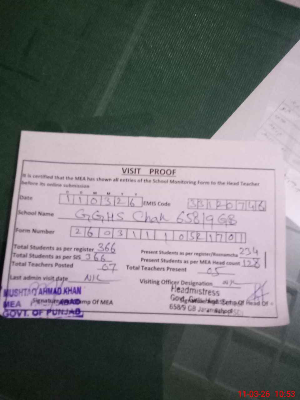 | Certified that this School was Inspected by the Undersigned MEA/DMO Today and the Information Stated Above is as Per Record. | |||||