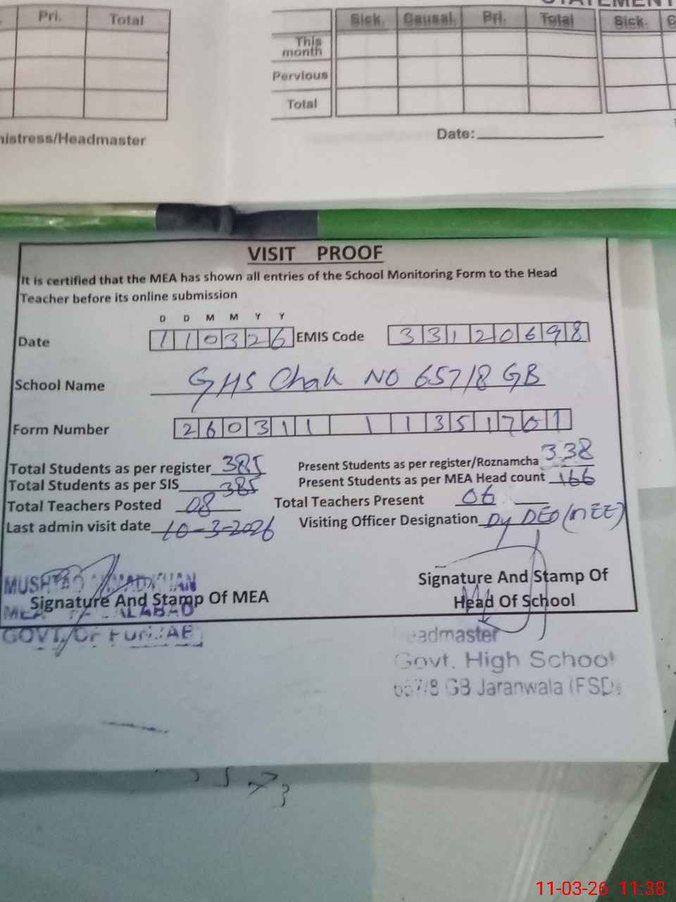 | EMIS Code: 33120698 | Name of School: GHS CHAK NO 657/8 GB | |||