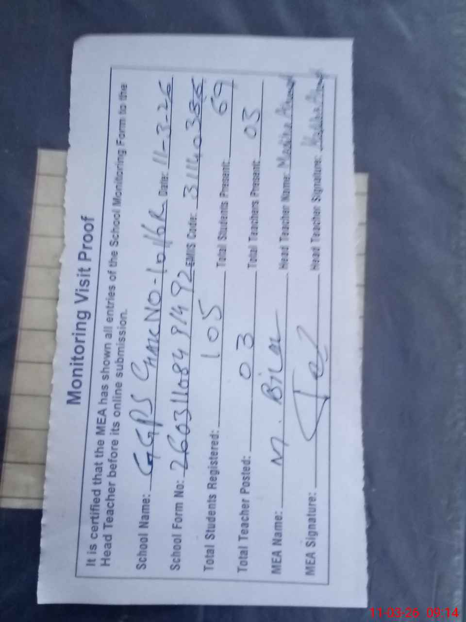 | Attendance Register | Head Teacher | MEA with School | Visit Proof |