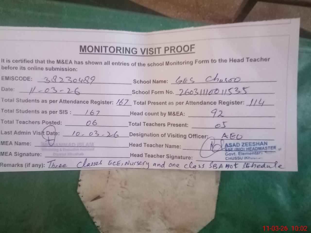 | Remarks (Use Separate Page if Required): AEO visited school on 10 March 2026 students strength on sis 167 Three classes ECE, Nursery, one SBA not schedule therefore not present in today visit | |||||