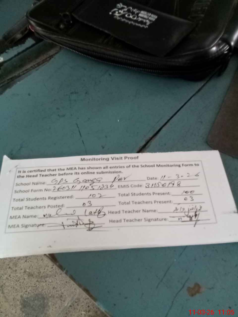 | Attendance Register | Head Teacher | MEA with School | Visit Proof |