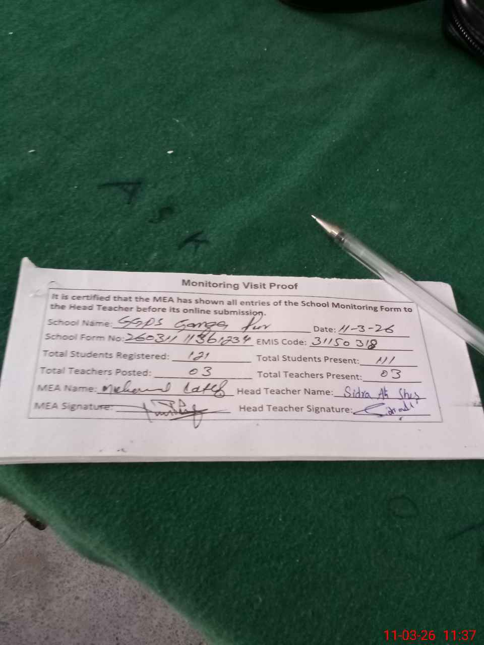| Attendance Register | Head Teacher | MEA with School | Visit Proof |