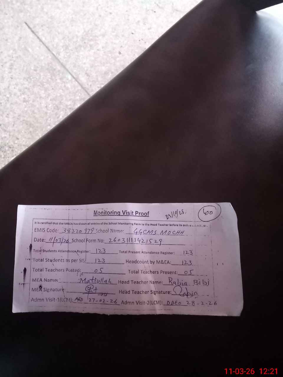 | Attendance Register | Head Teacher | MEA with School | Visit Proof |