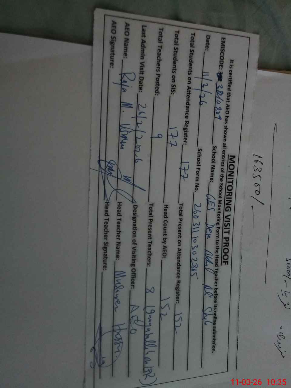 | Attendance Register | Head Teacher | MEA with School | Visit Proof |