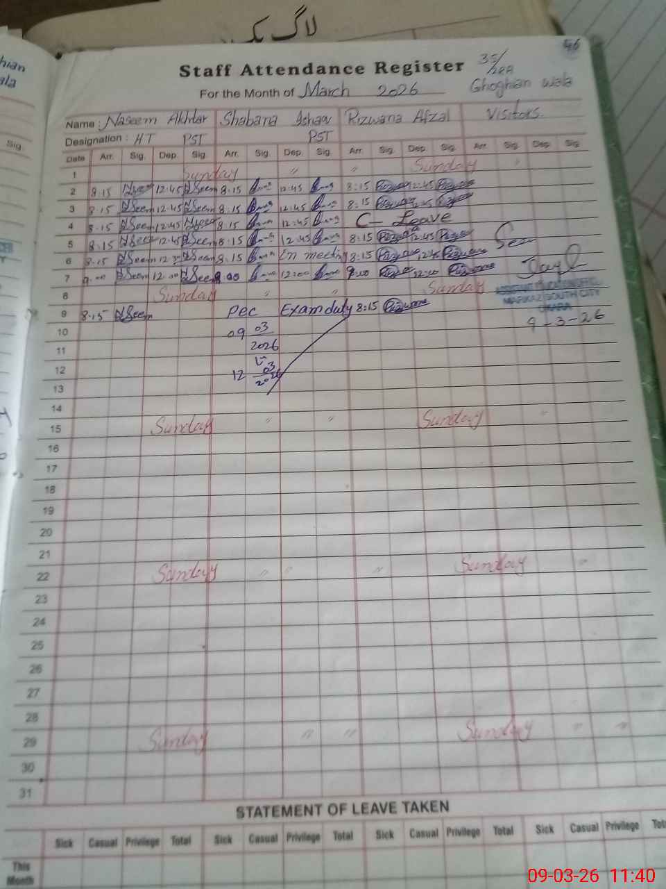 | 35**** | Sh**** Is**** | PST Arts | Regular | 0 | 0 | 0 | 0 | 0 | 0 | 0 | 0 | 0 | Exam Duty |