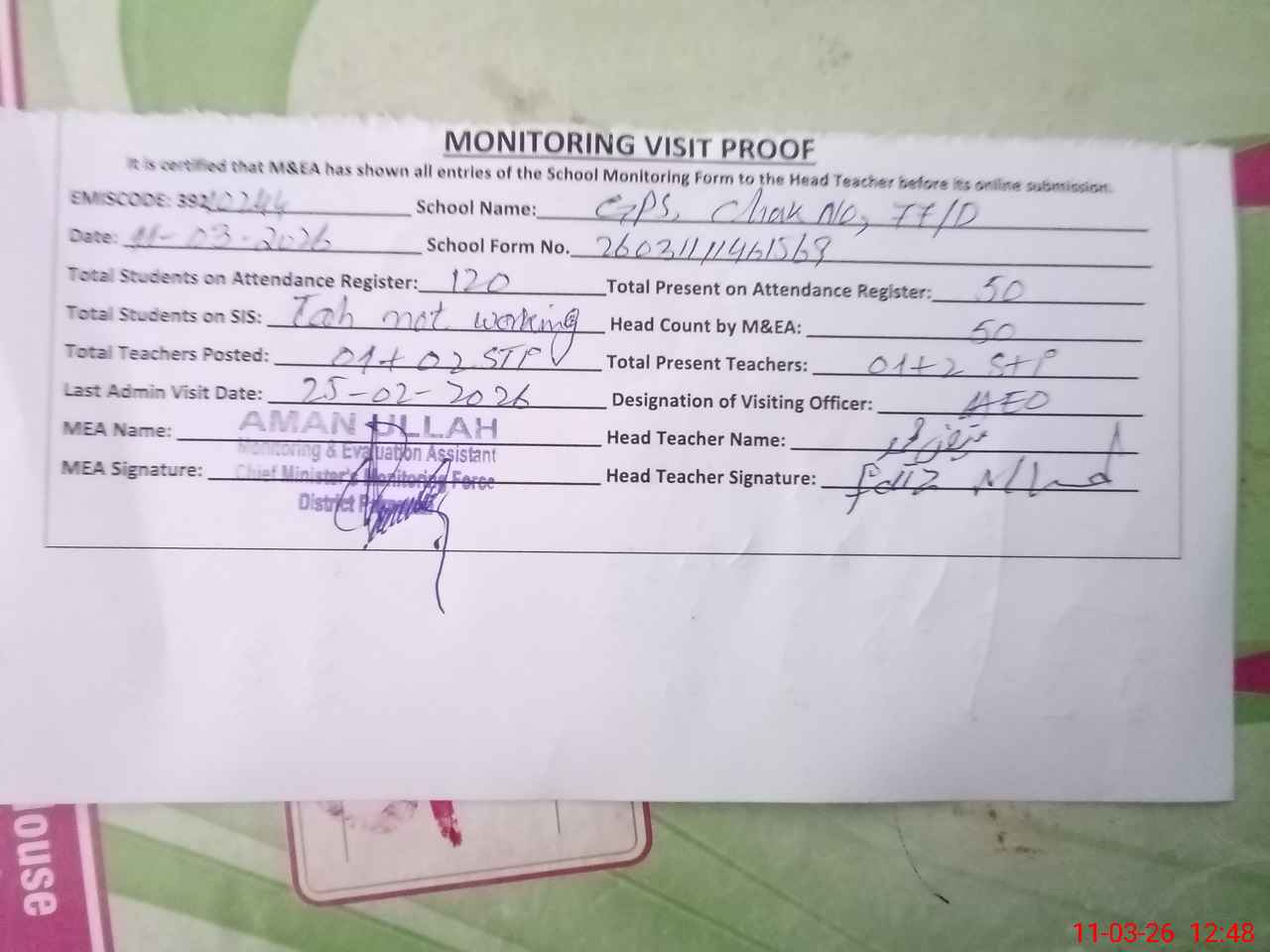 | Attendance Register | Head Teacher | MEA with School | Visit Proof |