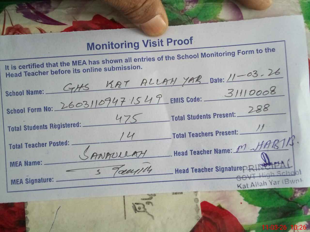 | Attendance Register | Head Teacher | MEA with School | Visit Proof |