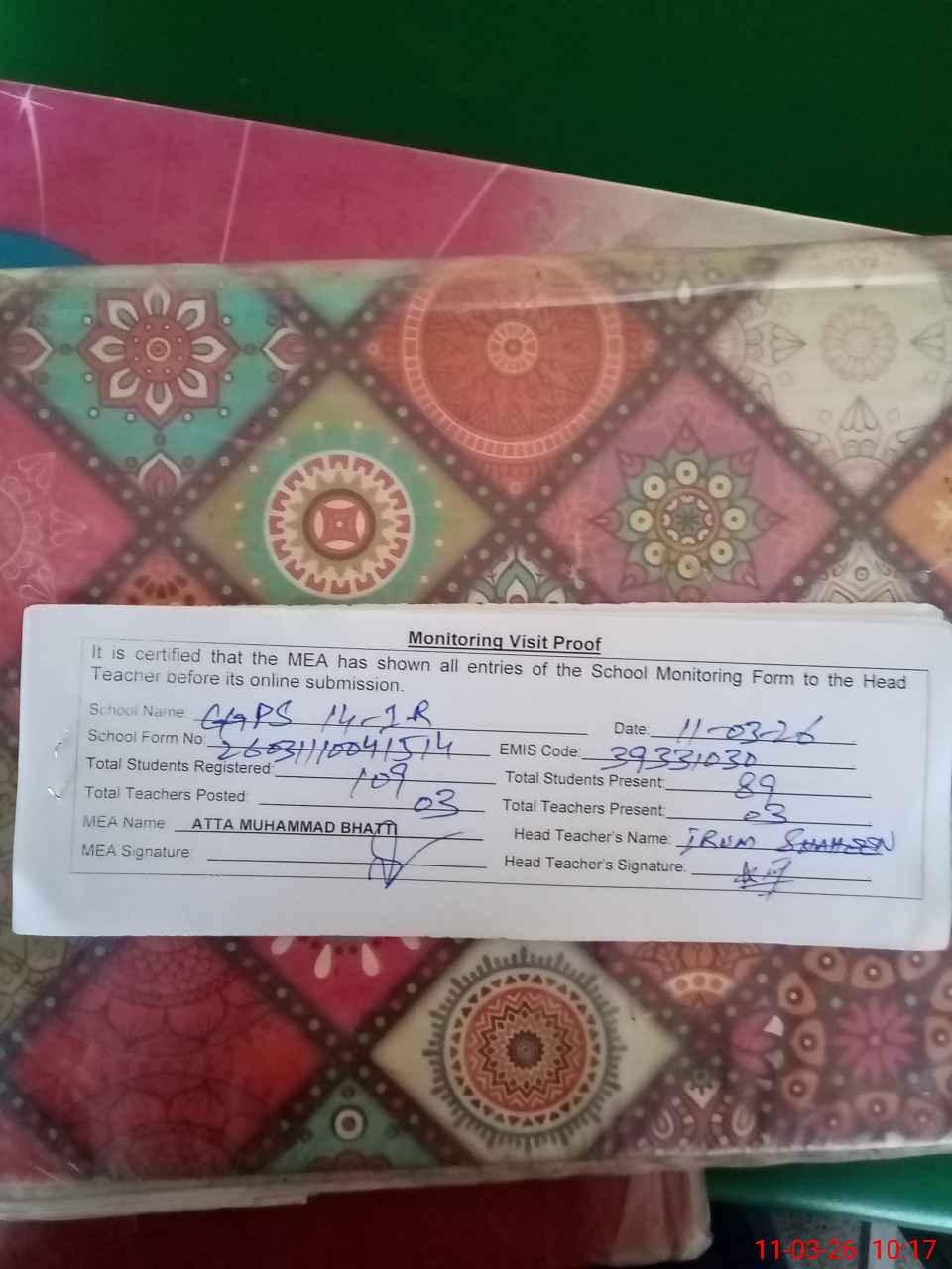 | Attendance Register | Head Teacher | MEA with School | Visit Proof |