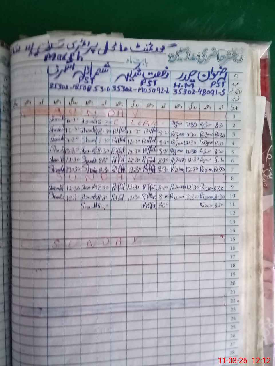| CNIC | Full Name | Designation | R/C | Absence During Last Calender Month |