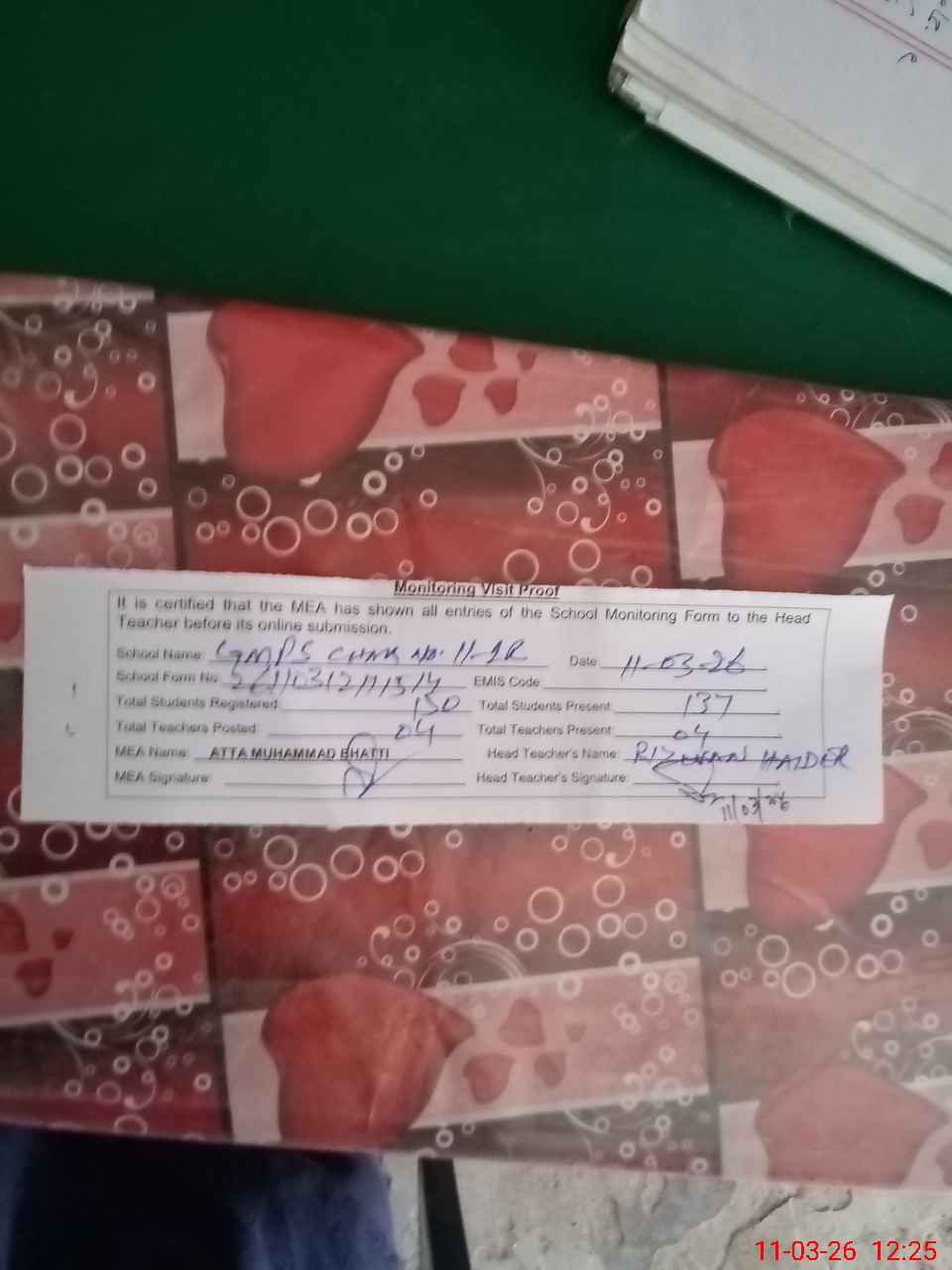| Attendance Register | Head Teacher | MEA with School | Visit Proof |