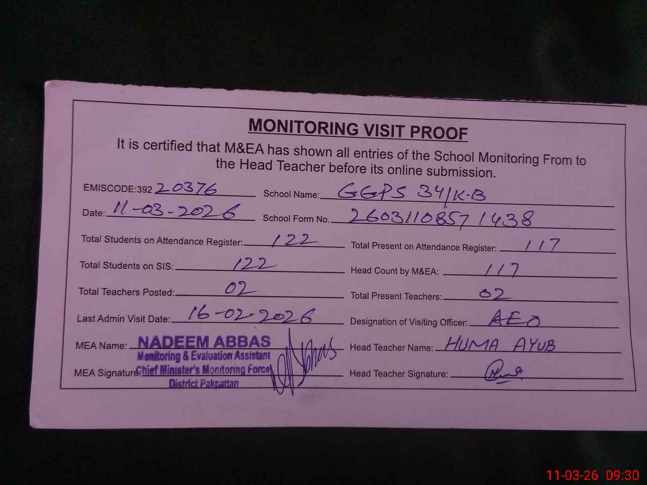 | Attendance Register | Head Teacher | MEA with School | Visit Proof |