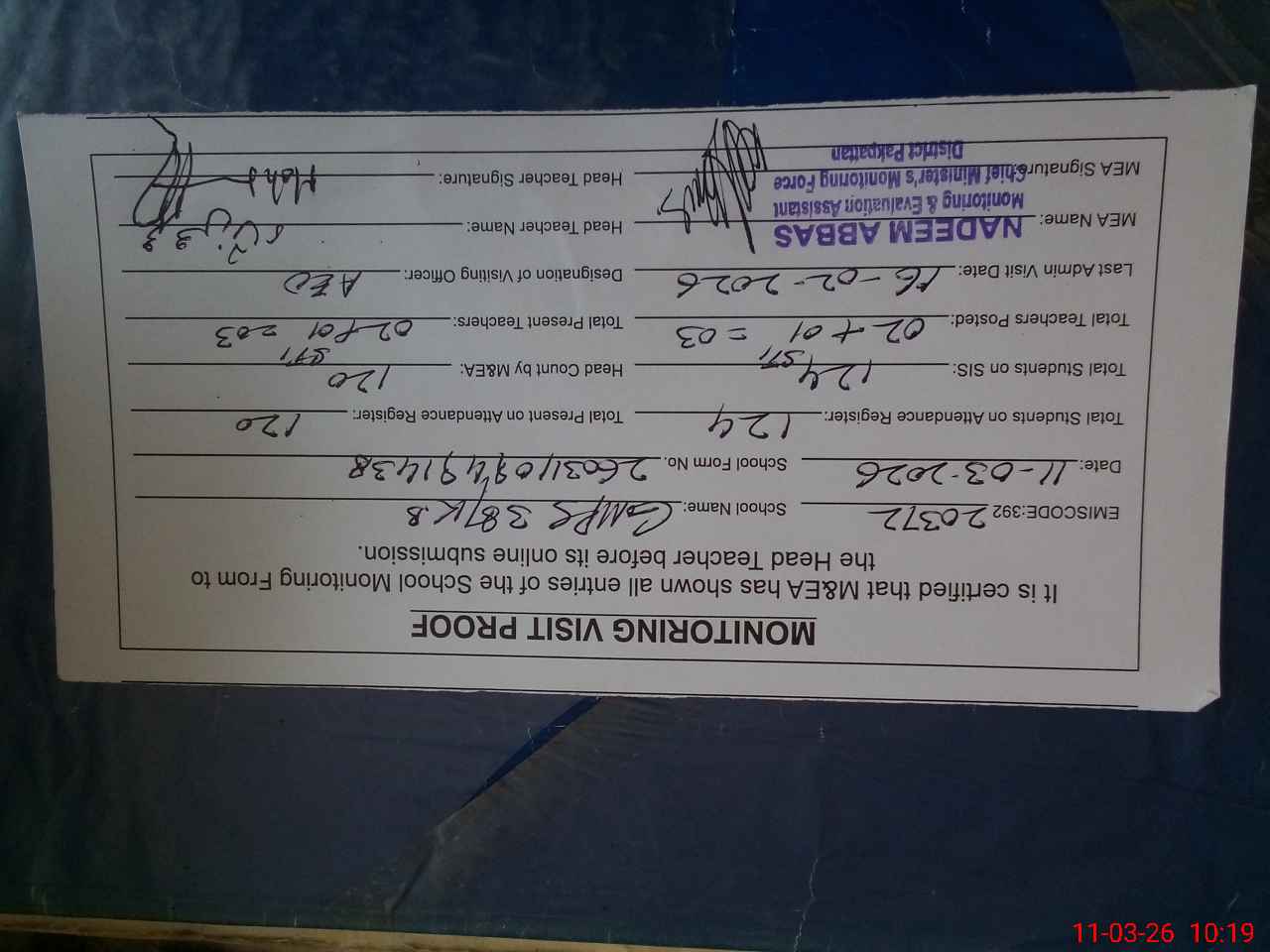 | Certified that this School was Inspected by the Undersigned MEA/DMO Today and the Information Stated Above is as Per Record. | |||||