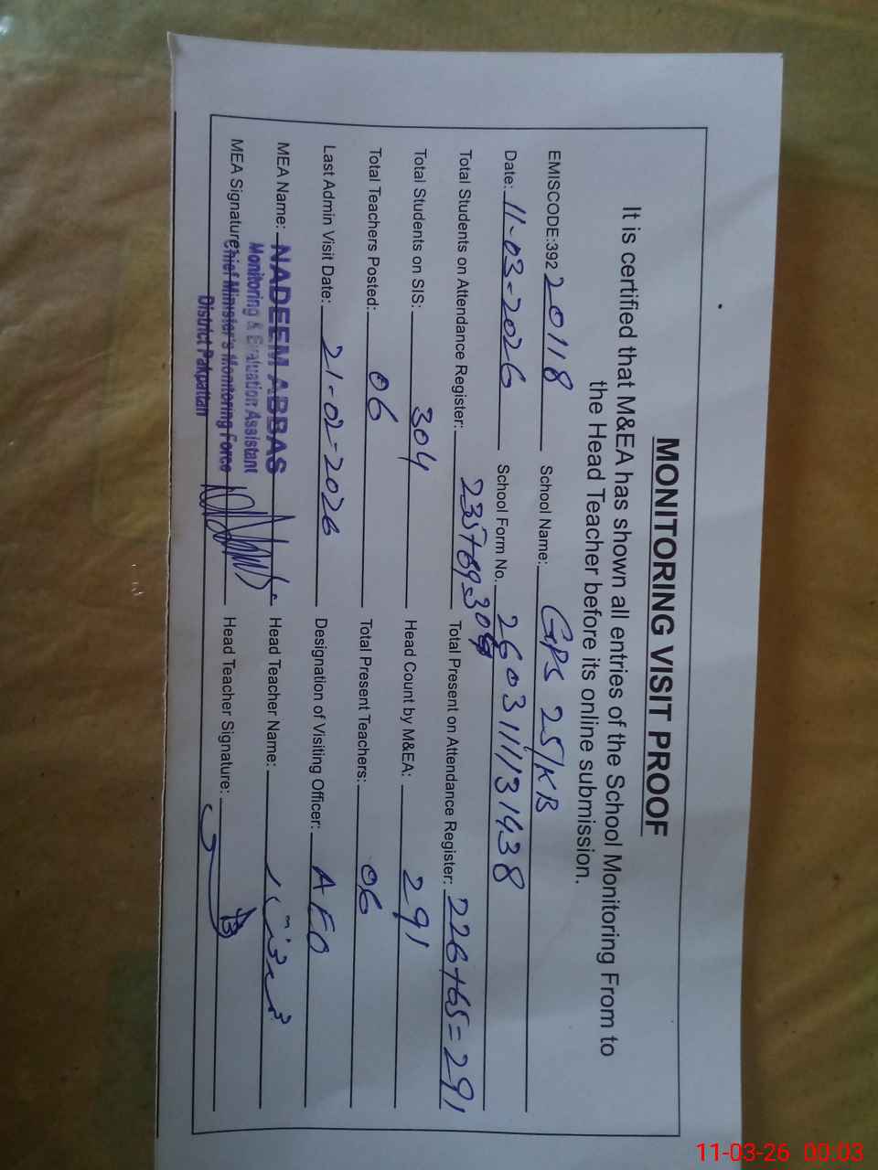 | Attendance Register | Head Teacher | MEA with School | Visit Proof |