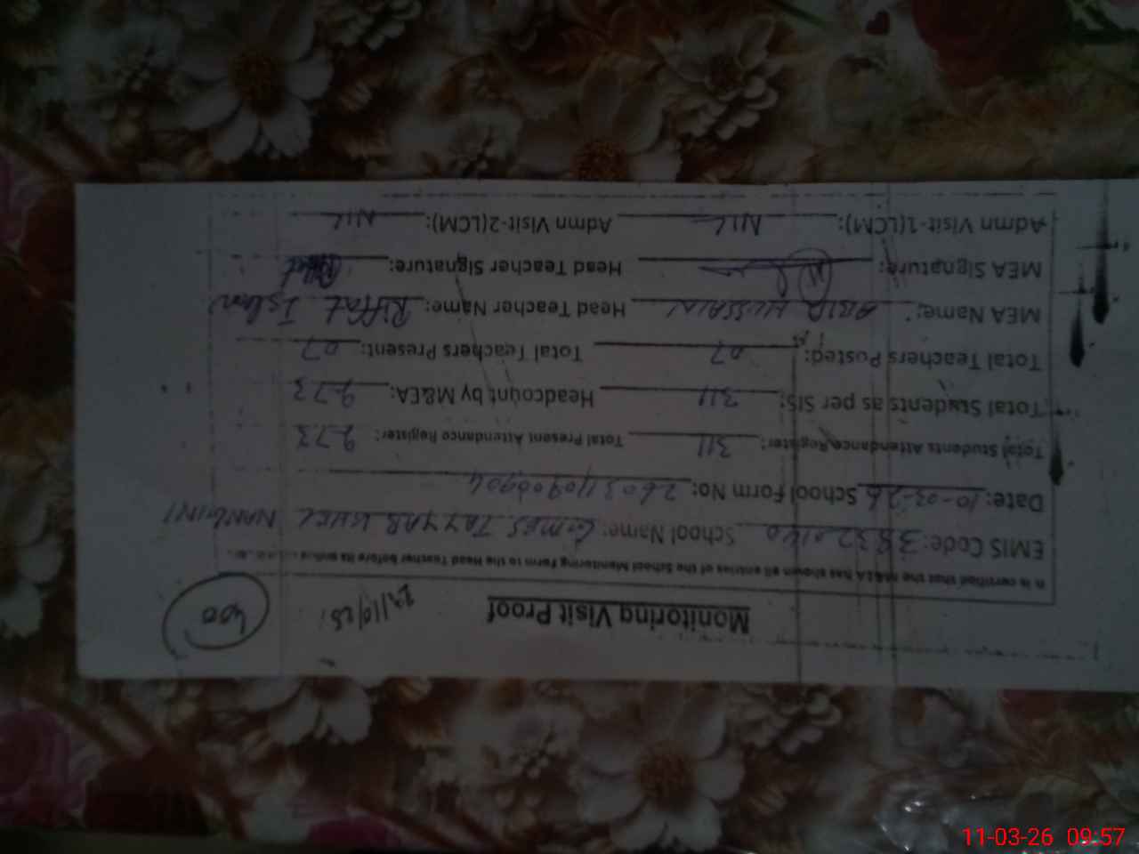 | Attendance Register | Head Teacher | MEA with School | Visit Proof |